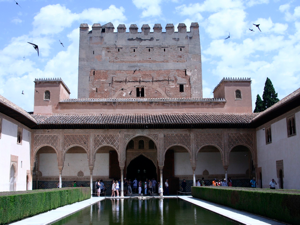 Today our guide was Israel; Claire could actually read the fine print on his badge and reported to us that his full name was Felix Israel Rodriguez Alonso. In any case, he got us all a taxi to take us to the Alhambra. We got a pretty extensive introduction to the area, and to what we’re going to see, as well as an insider’s view of the city of Granada (whose main industry, as it turns out, is tourism). The Alhambra was first constructed as a fortress high on a hill, but was later turned into a Moorish palace. Its gardens are stunning, and the architecture is interesting because we learned what makes it distinctively Moorish (lacelike walls, courtyards with fountains, Arabic inscriptions, arches, tile work, honeycomb vaulted ceilings, the use of symmetry in design, with only the depiction of plants and animals, not humans). This became useful later in our trip, as we began to recognize these elements in other places.